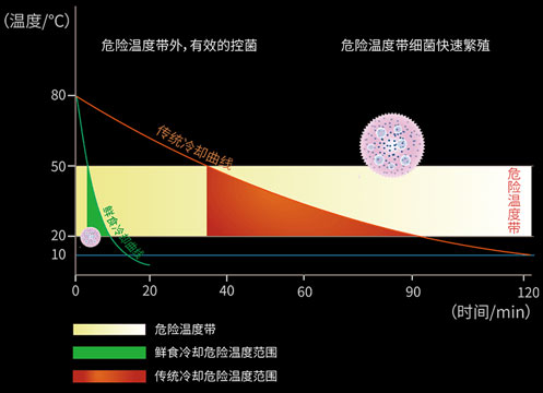 環速真空冷卻機,相比傳統的風冷、水冷、冷庫等方式,具有高效、節能、衛生的顯著優勢。它可以快速將高溫食品降至常溫或更低的溫度,根據食材種類的不同,耗時控制在3-18Min之內,效率及產能有了根本的保障;整個冷卻過程均在密閉的真空環境中進行,只需利用食品自身所含有的水分充當媒介,無需額外的制冷手段,因此避免了食品與外部環境的接觸,杜絕了外源污染;快速冷卻使食品避開微生物繁殖活躍期,從而得以延長食品的保鮮期。